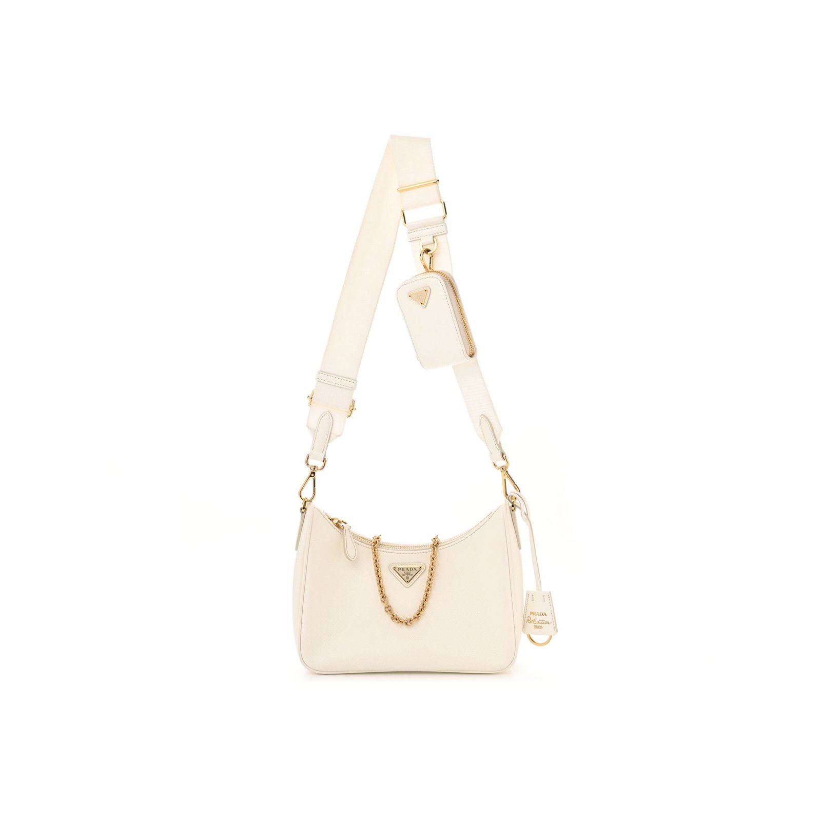 This is an authentic PRADA Saffiano Re-Edition 2005 Shoulder Bag in White. This shoulder bag is crafted of Prada signature saffiano crossgrain leather in white. The set features an adjustable white nylon shoulder strap, an optional gold chain-link strap, polished gold hardware and a removable coin purse. The top zipper opens to a black Prada monogram jacquard fabric interior.