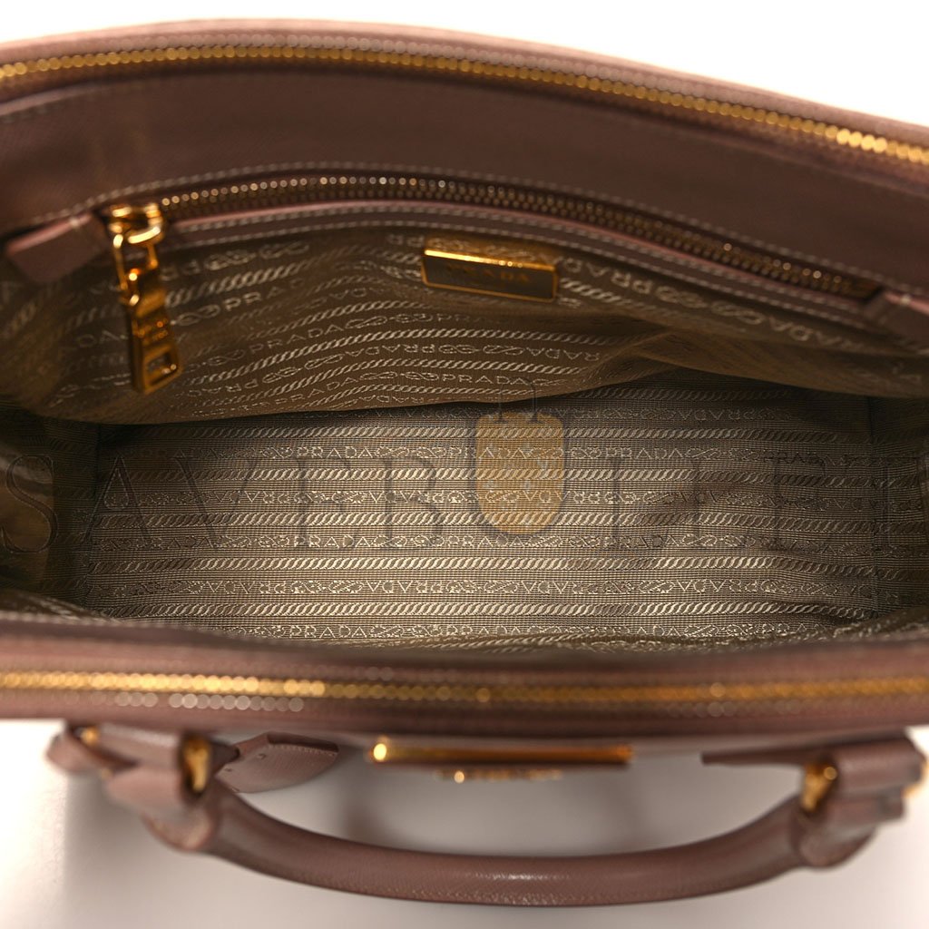 This is an authentic�PRADA Saffiano Small Galleria Double Zip Tote in Cammeo. This tote is crafted of saffiano lux cross-grain leather in pink beige. The bag features rolled leather top handles, an optional shoulder strap with polished gold plated links, and a hanging clochette. The top opens to two full-length top zippered compartments and a Prada jacquard interior with zipper and patch pockets.