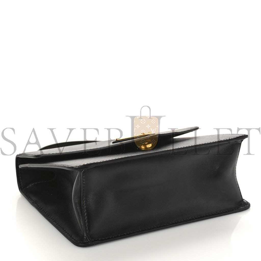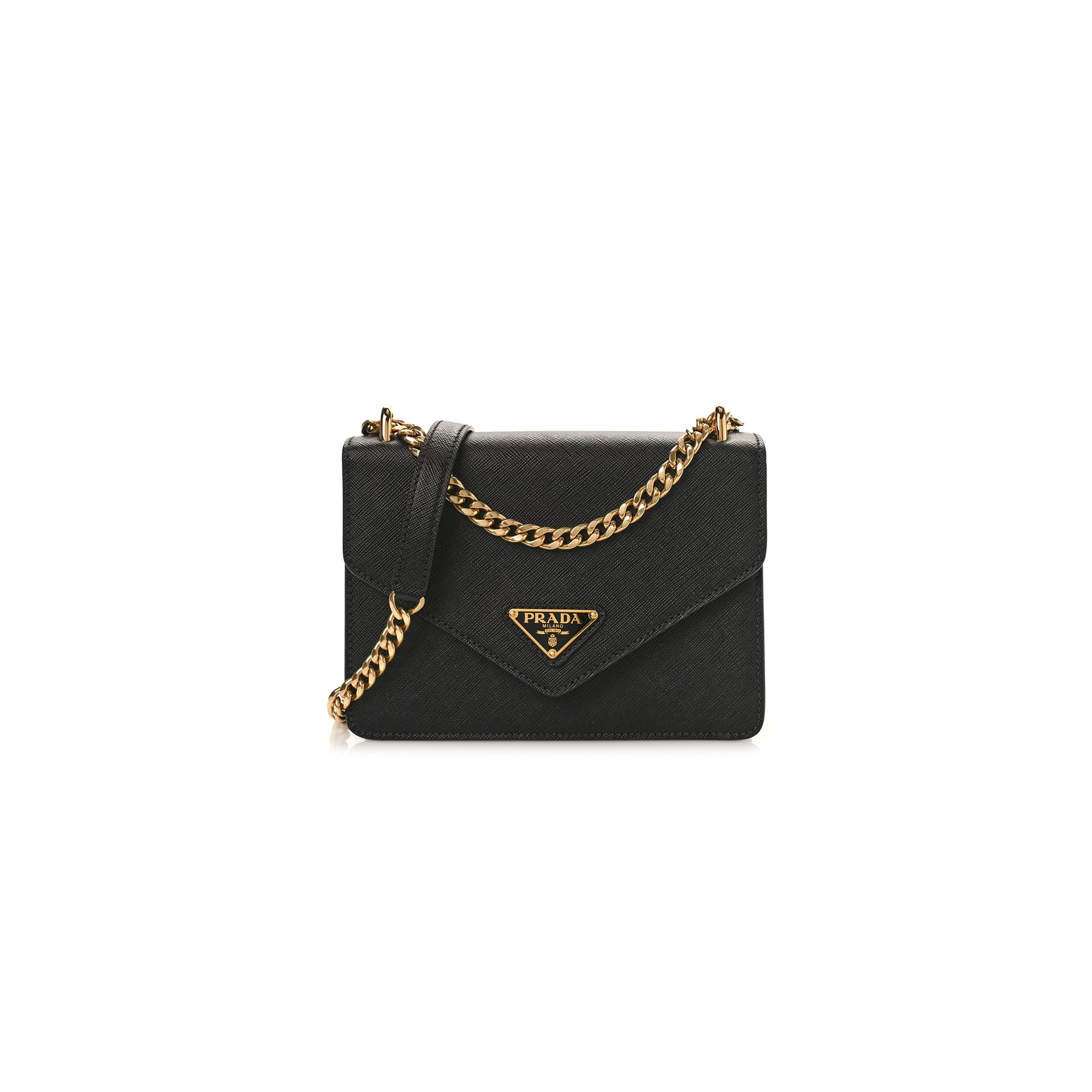 This is an authentic PRADA Saffiano Soft Calfskin Chain Shoulder Bag in Black. This chic shoulder bag is crafted of Prada signature saffiano crossgrain leather in back. The bag features a gold chain shoulder strap, gold hardware, and a front flap that opens to a black fabric interior with a patch pocket.