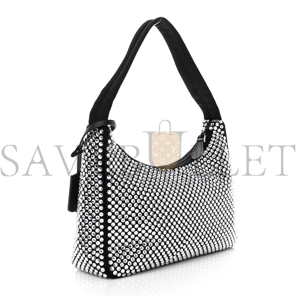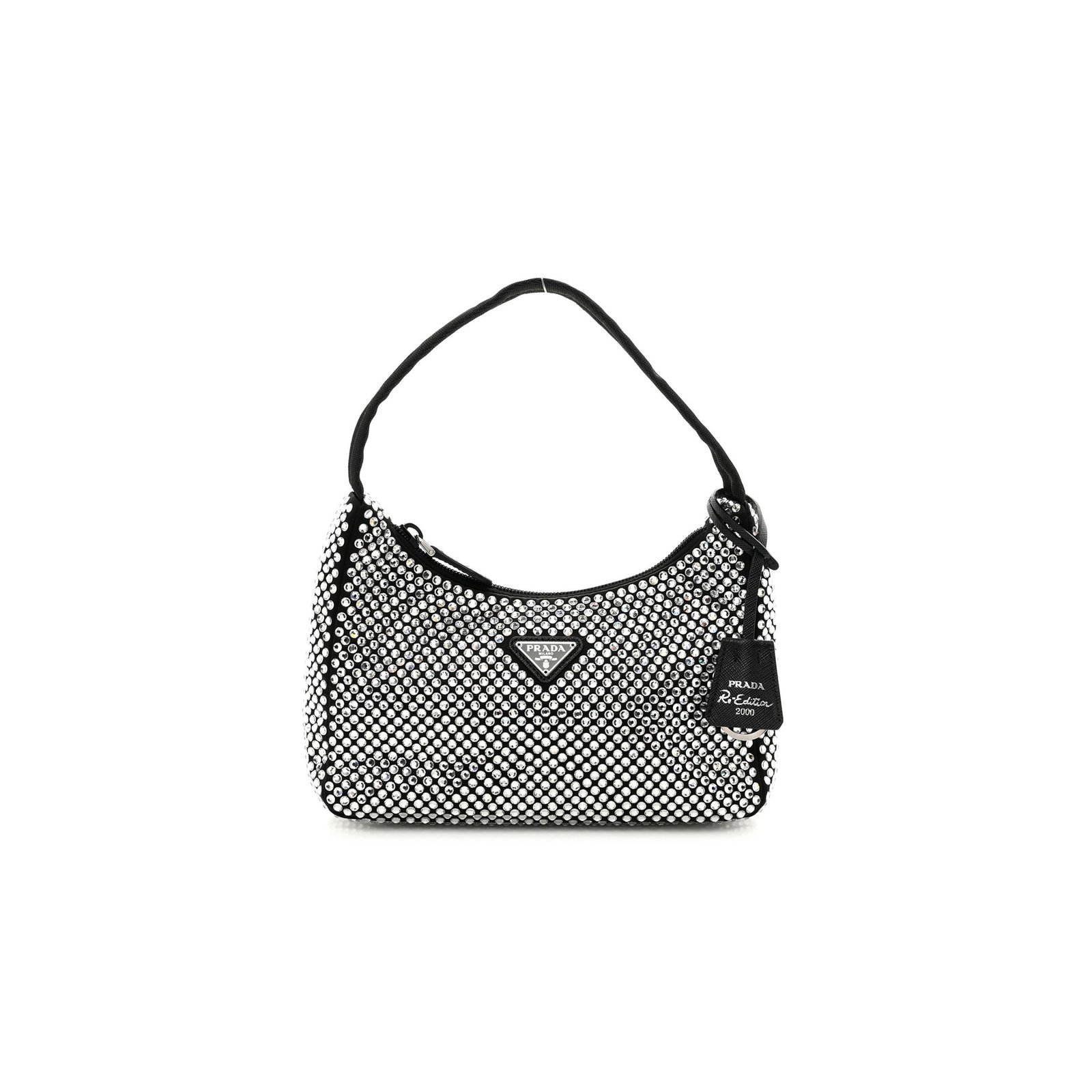 This is an authentic PRADA Satin Crystal Mini Re-Edition 2000 Bag in Black. This Prada handbag is crafted of crystal embellished black satin with silver hardware. The bag features a black nylon shoulder strap and the top zipper opens to a black satin interior.