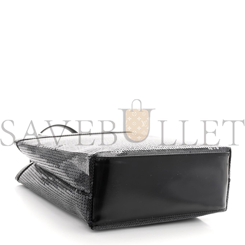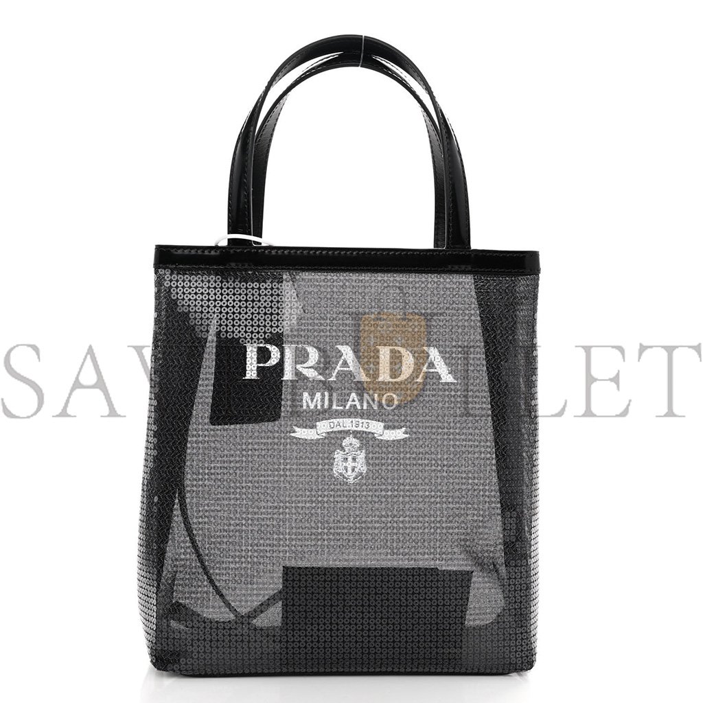 This is an authentic PRADA Sequin Mesh Small Tote Bag in Black. This Prada handbag is crafted of sturdy black mesh with black sequins throughout. The bag features a printed white Prada logo, black leather strap handles, an open top, and an unlined mesh interior with a matching leather removable pouch.