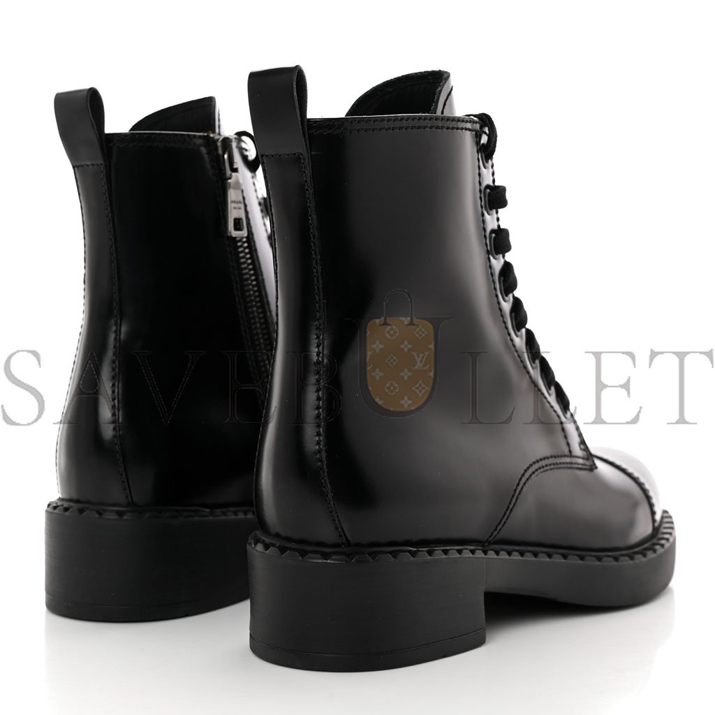 This is an authentic pair of PRADA Spazzolato Chocolate 50mm Combat Boots size 36 in Black. These chic platform boots are crafted of black polished calfskin leather. They feature black stacked rubber platform soles.