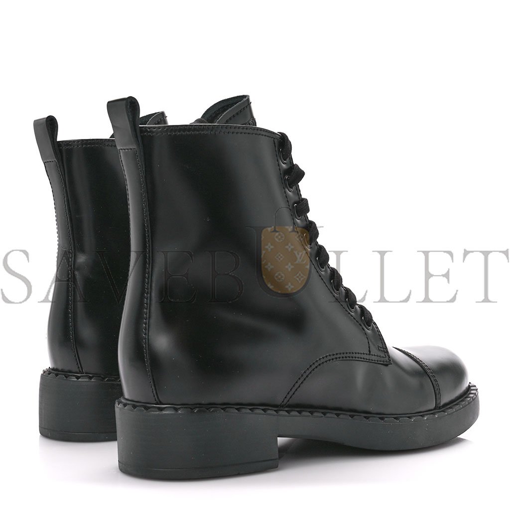 This is an authentic pair of PRADA Spazzolato Chocolate 50mm Combat Boots size 40 in Black. These chic platform boots are crafted of black smooth calfskin leather. They feature rubber platform soles, a side zip closure, and an embossed logo.