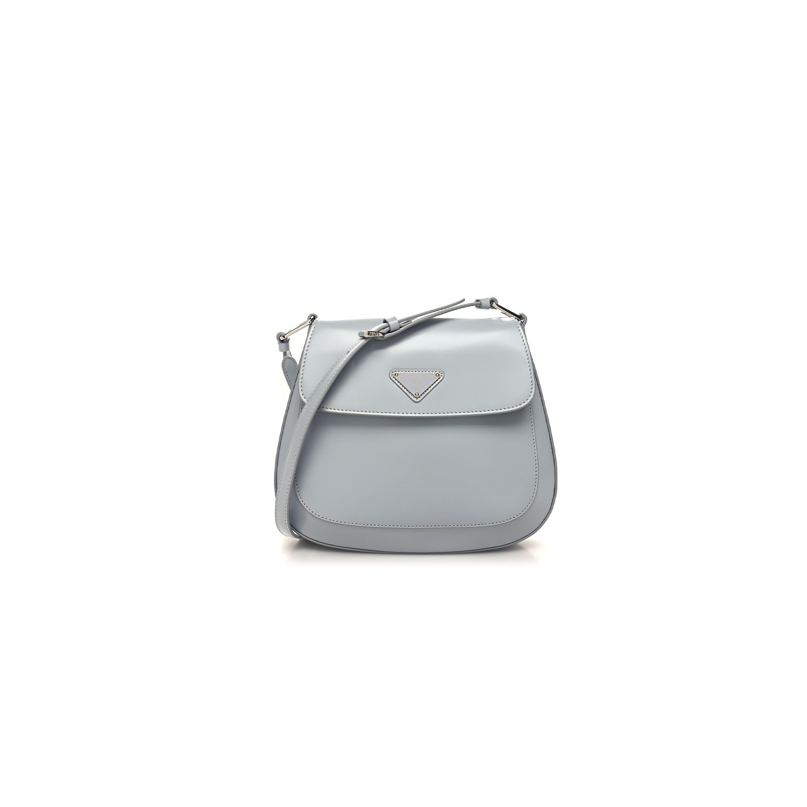 This is an authentic PRADA Spazzolato Cleo Flap Shoulder Bag in Fiordaliso. This chic shoulder bag is crafted of pale blue leather. The magnetic closure opens to a black Prada jacquard interior with a leather patch pocket.