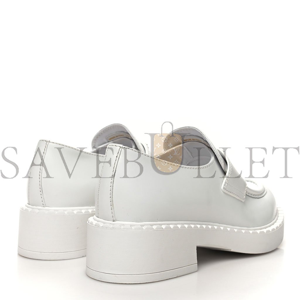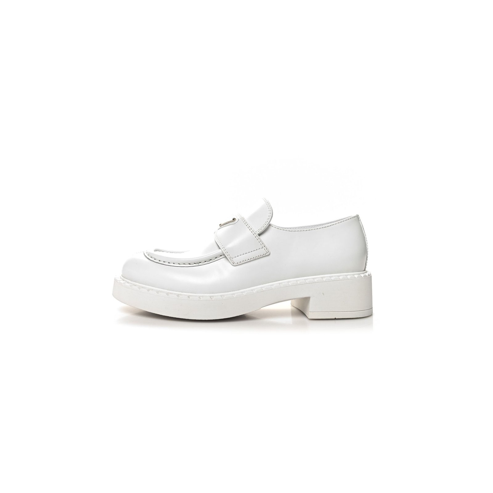 This is an authentic pair of PRADA Spazzolato Metal Triangle Logo 50mm Loafers size 39.5 in White. These stylish loafers are crafted of white leather with white stitching, a Prada emblem, and rubber soles.