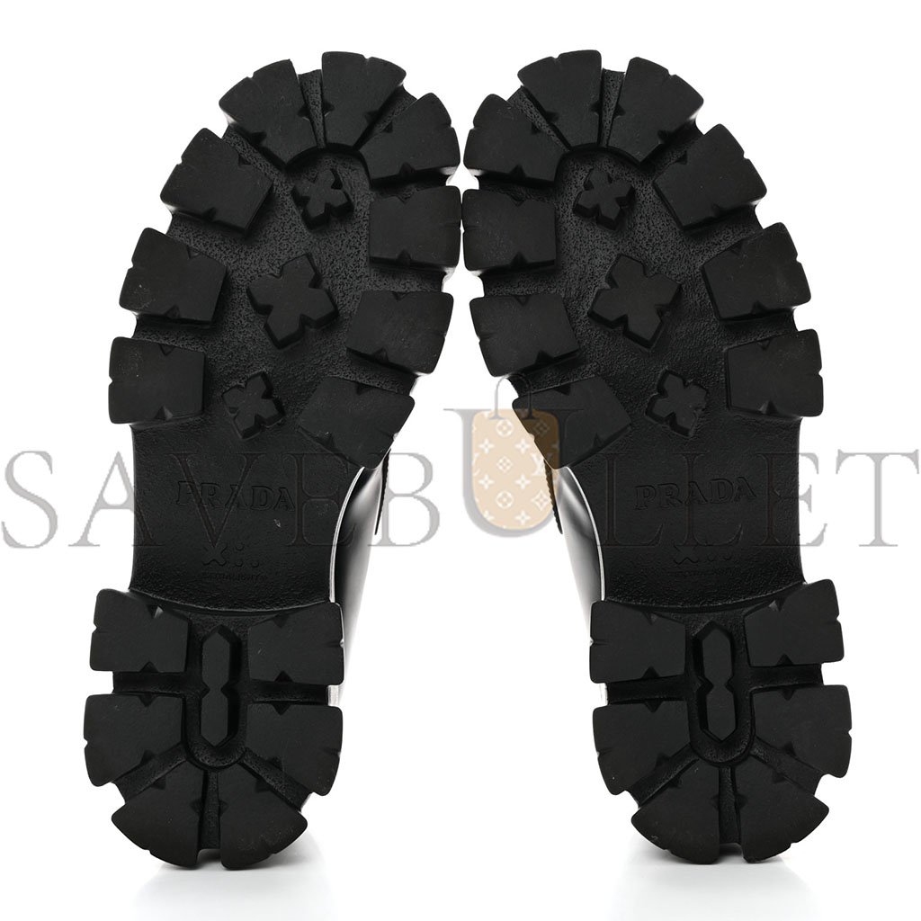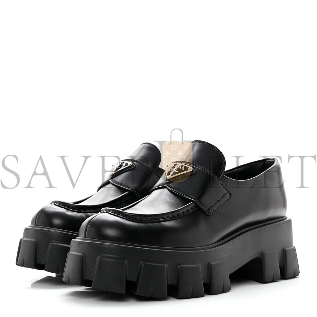 PRADA SPAZZOLATO ROIS METAL TRIANGLE LOGO MONOLITH 55MM LOAFERS 39 BLACK