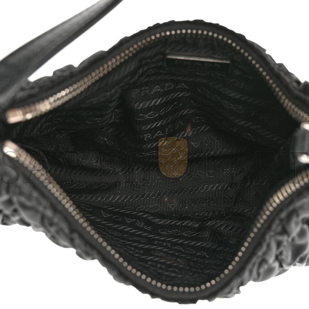 This is an authentic PRADA Tessuto Nylon Gaufre Shoulder Bag in Black. This petite Prada handbag is crafted of pleated black tessuto nylon. The bag features a looping leather shoulder strap and the silver top zipper opens to a black jacquard fabric interior.