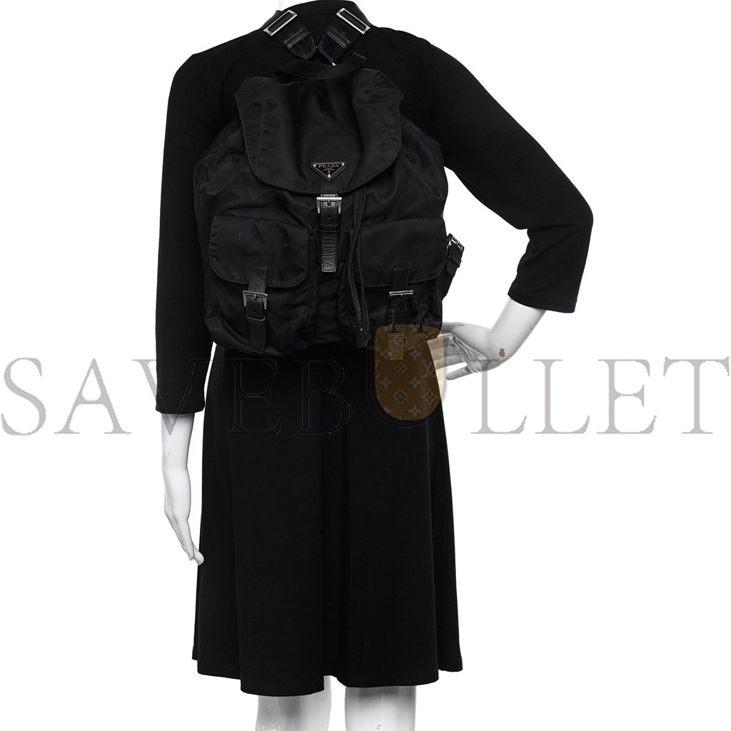 This is an authentic PRADA Tessuto Nylon Saffiano Medium Backpack in Black. This backpack is crafted of fine nylon in black. The shoulder bag features adjustable nylon shoulder straps with silver buckles, two external flap pockets, and a top cross-over flap with a strap and silver buckle closure. This opens to a nylon cinch cord and a black Prada monogram jacquard fabric interior with a zipper pocket.