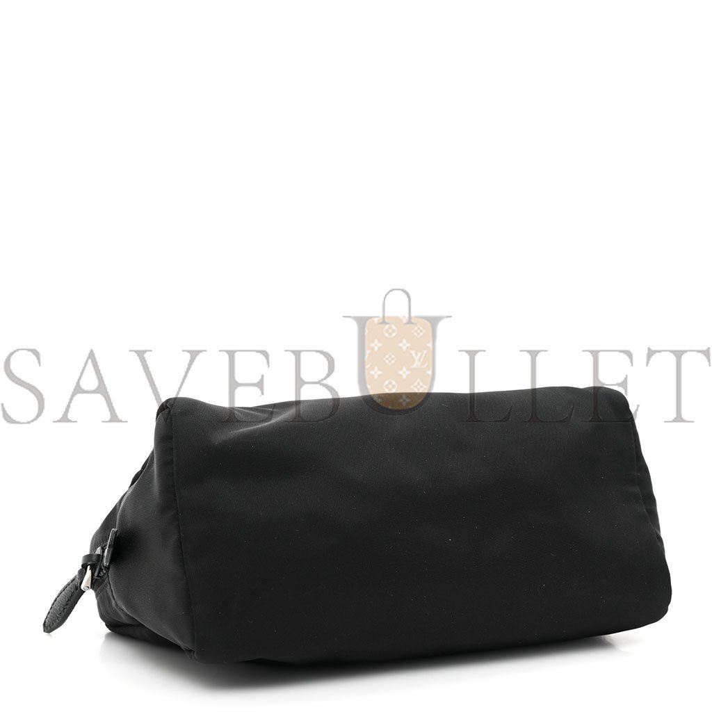 This is an authentic PRADA Tessuto Nylon Saffiano Wristlet in Black. This stylish pouch is crafted of fine nylon in black. The bag features an optional saffiano cross-grain leather wristlet strap, a facing Prada logo plate, and a top zipper that opens to a black monogram jacquard fabric interior.
