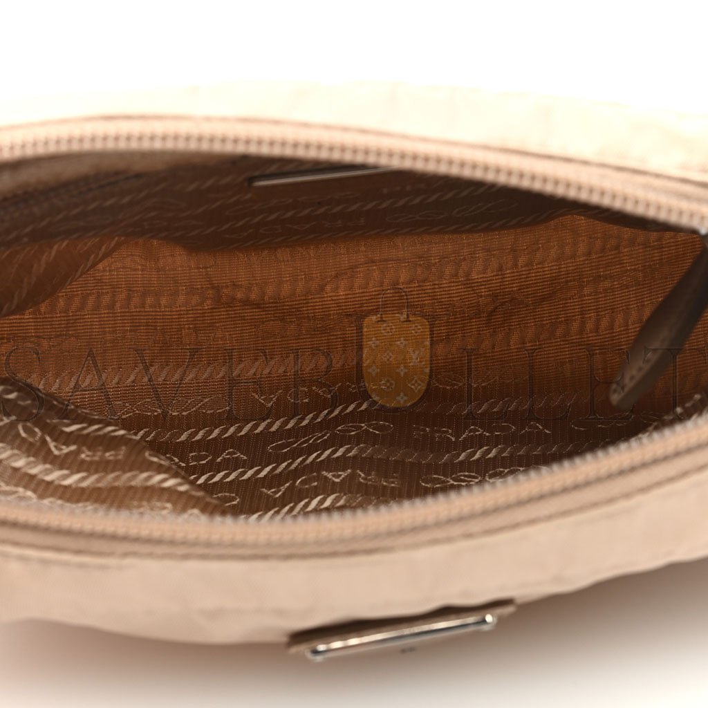 This is an authentic PRADA Tessuto Nylon Saffiano Wristlet in Cammeo. This stylish clutch is crafted of tessuto nylon in beige. The bag features a saffiano leather wristlet and a zipper pull that opens to a matching fabric interior with a zipper pocket.