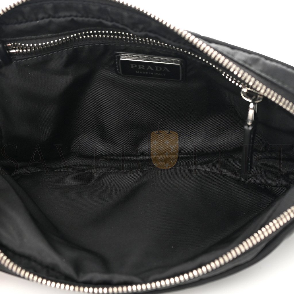 This is an authentic PRADA Tessuto Re-Nylon Logo Print Belt Bag in Black. This chic belt bag is crafted of recycled nylon fabric in black with a white printed logo on the front. The bag features a long front zipper pocket, an enameled metal triangle logo on the back and polished silver hardware. The top zipper opens to a black fabric interior with a zipper pocket.