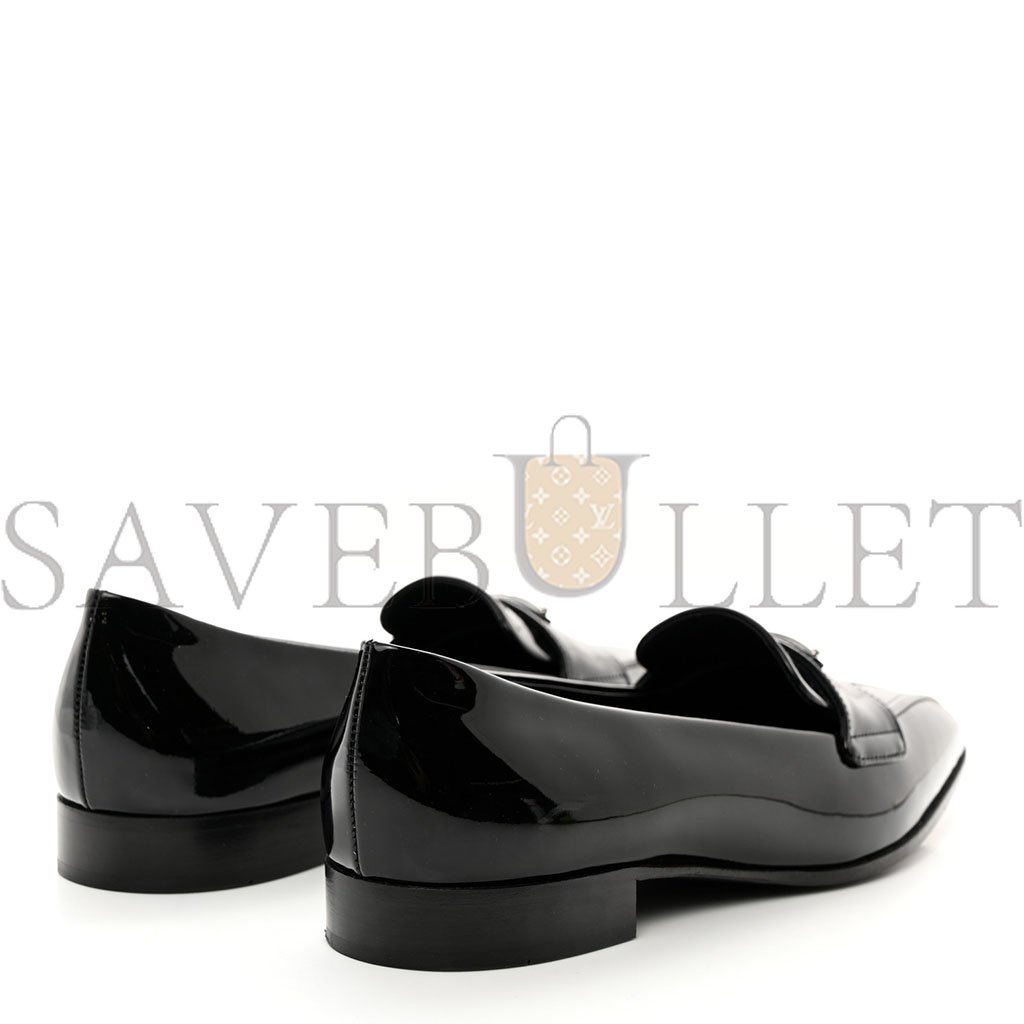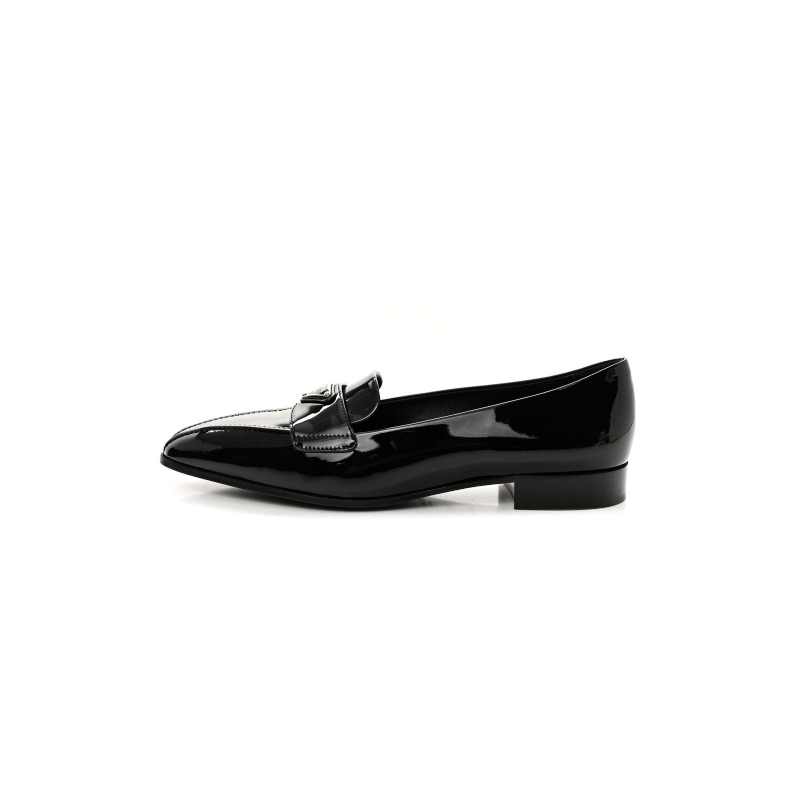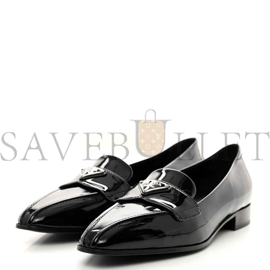 PRADA VERNICE METAL TRIANGLE LOGO POINTED TOE 25MM LOAFERS 37.5 BLACK