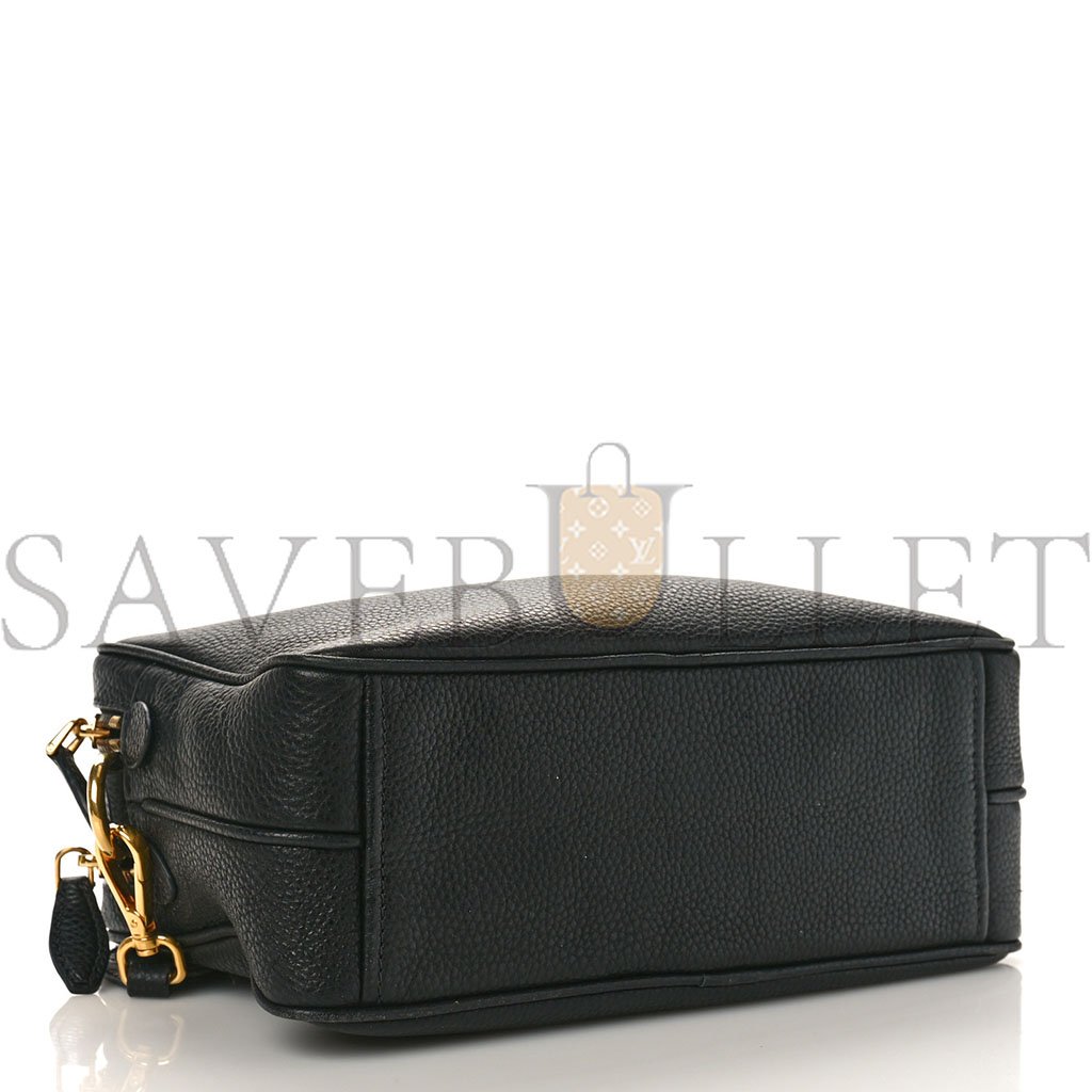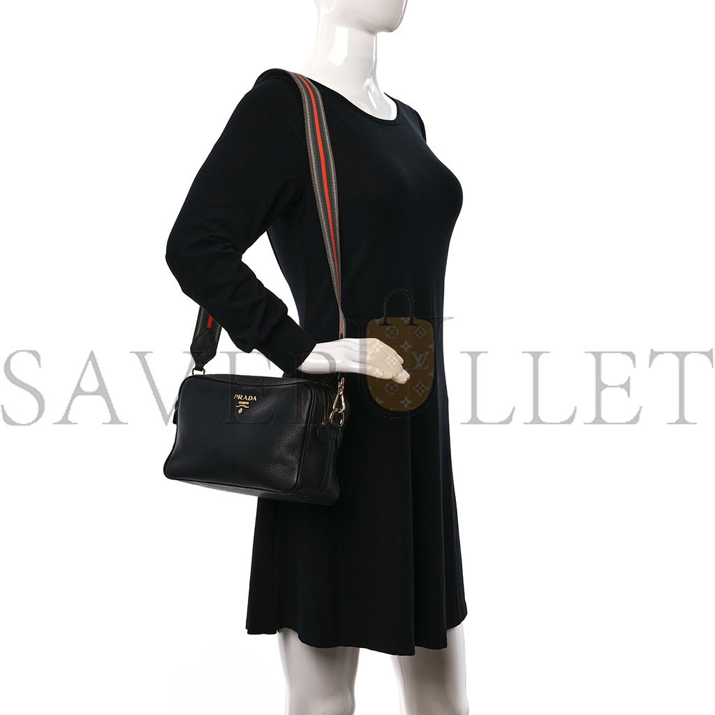 This is an authentic�PRADA Vitello Daino Camera Crossbody in Black. This crossbody bag is beautifully crafted of calfskin leather in black. The bag features an adjustable black leather shoulder strap with polished brass hardware. The top zippers each open to a compact black Prada monogrammed fabric interior.