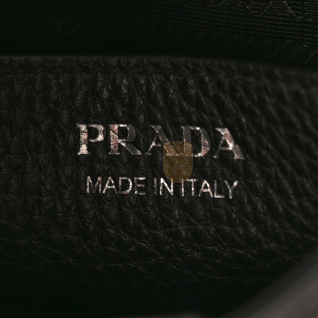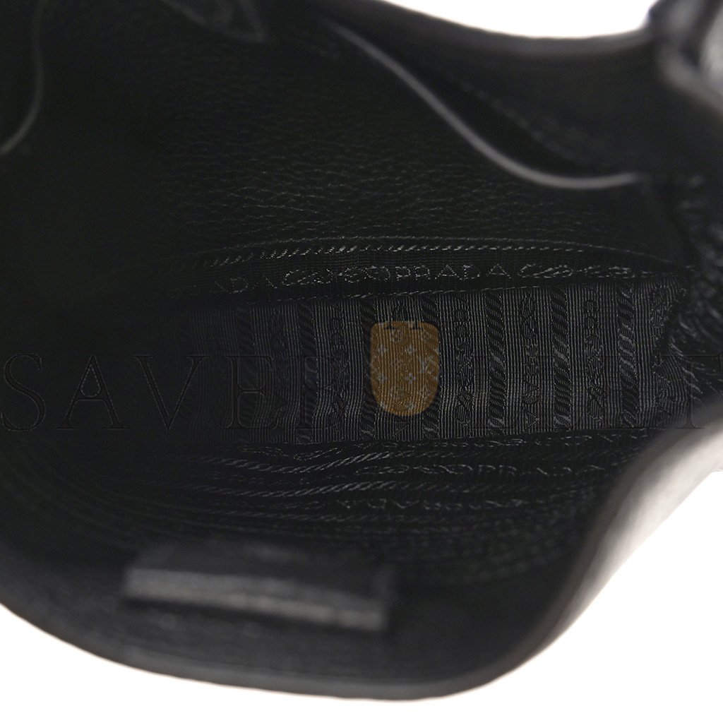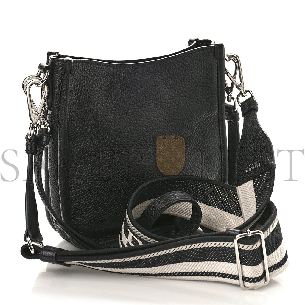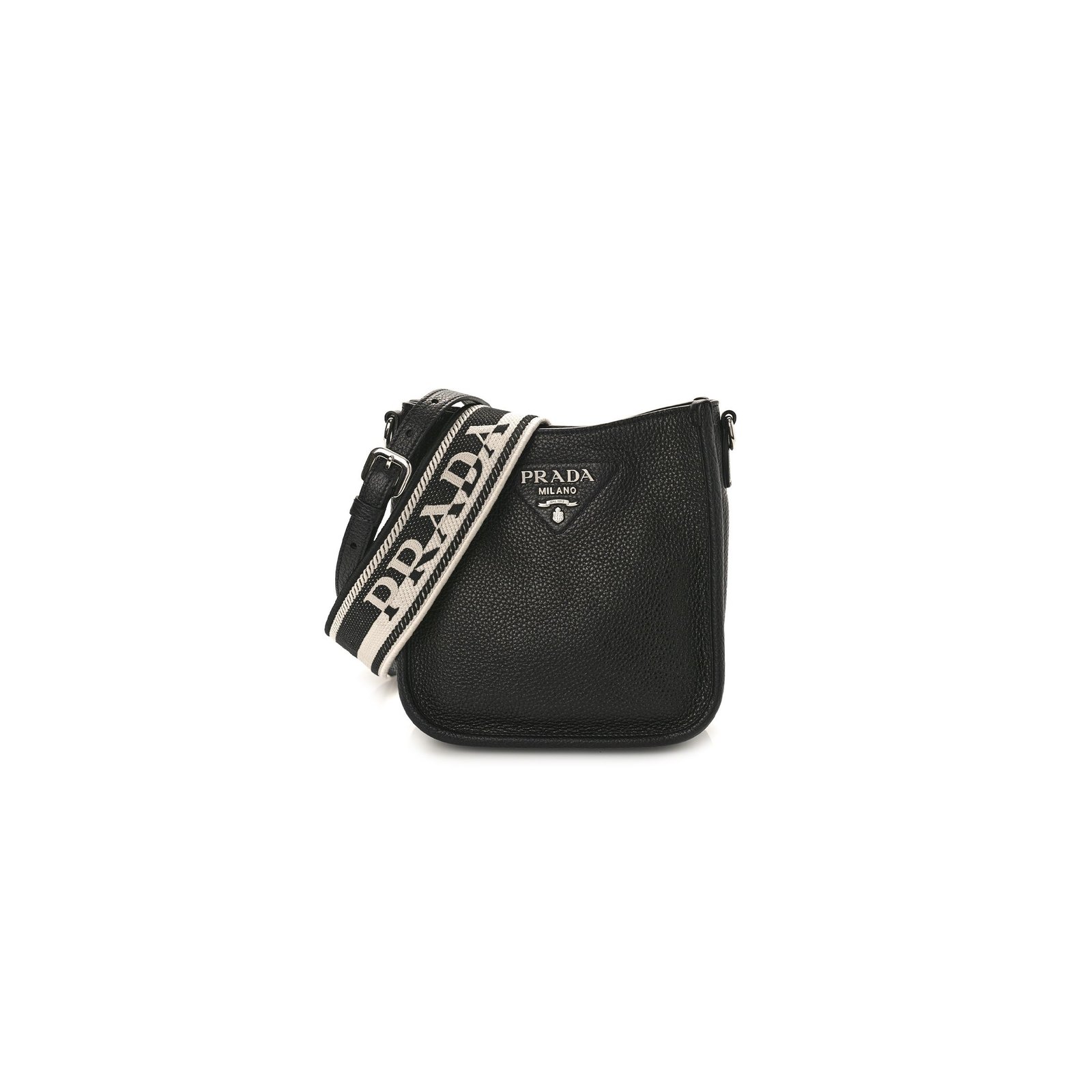 This is an authentic PRADA Vitello Daino Soft Mini Shoulder Bag in Black. This shoulder bag is crafted of luxuriously textured calfskin leather in black. The bag features an adjustable shoulder strap with silver hardware. The top opens to a Prada jacquard fabric interior.