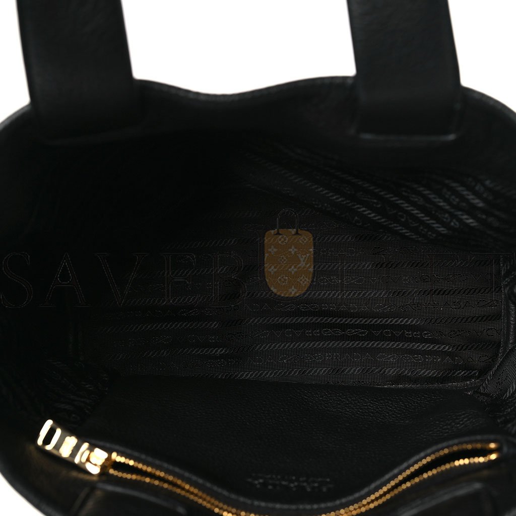 This is an authentic PRADA Vitello Daino Soft Perforated Logo Tote in Black. This stylish shoulder bag is finely crafted of textured calfskin leather in black. The top opens to a black Prada logo jacquard weave fabric interior with zipper and patch pockets.