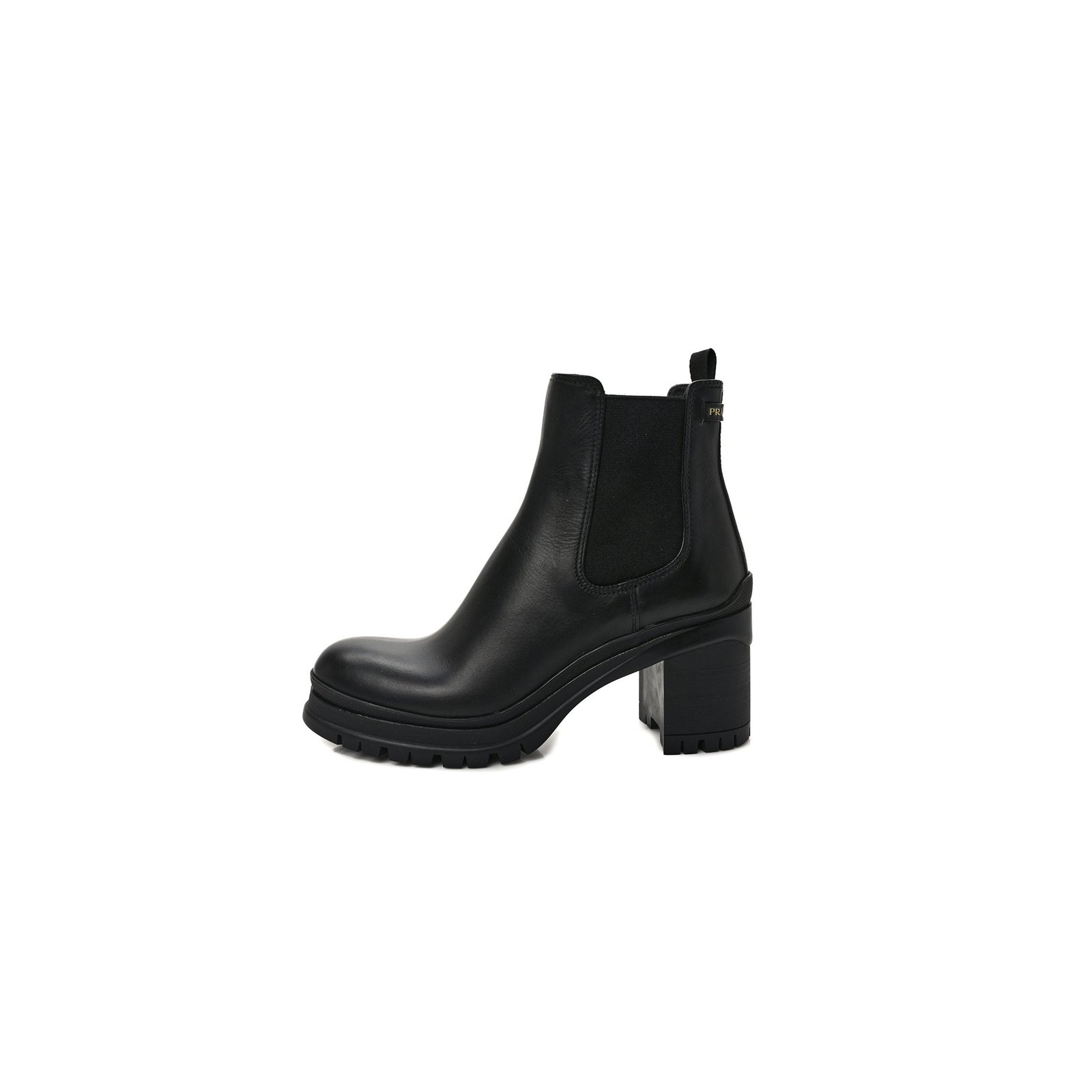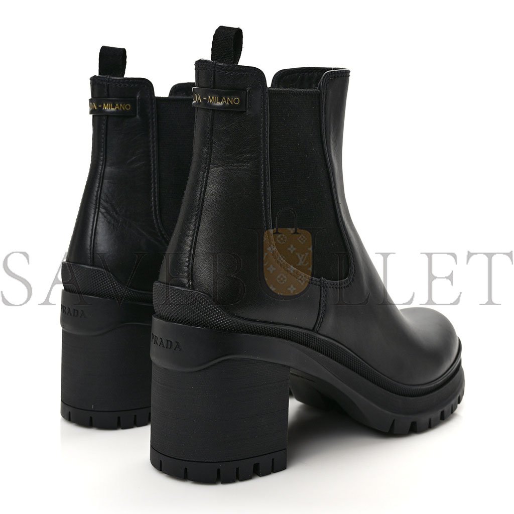 This is an authentic pair of PRADA Vitello Montana Lug Sole Chelsea 55mm Boots size 40 in Black. These ankle boots are crafted of smooth black leather with elastic side inserts and rugged 3-inch rubber heels.