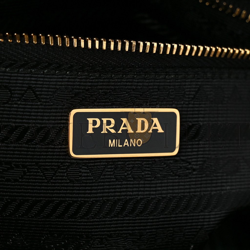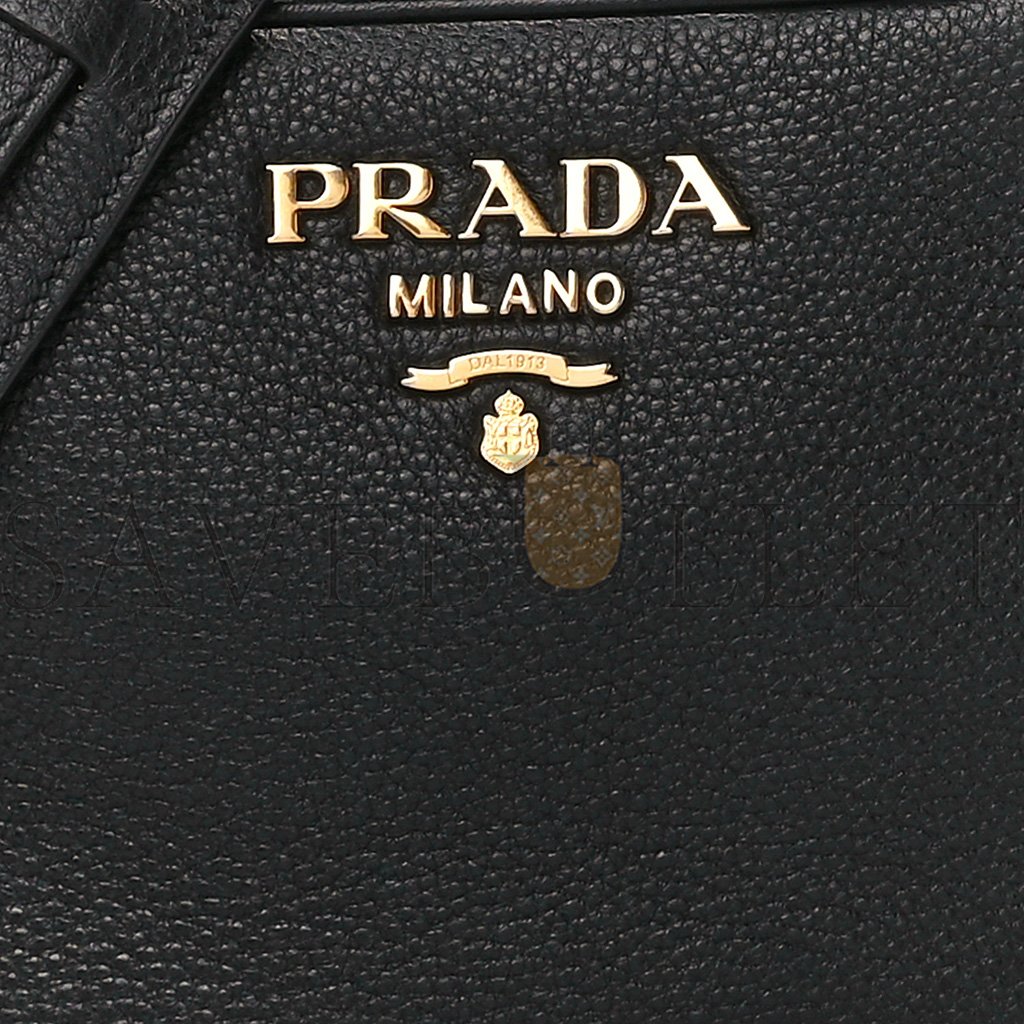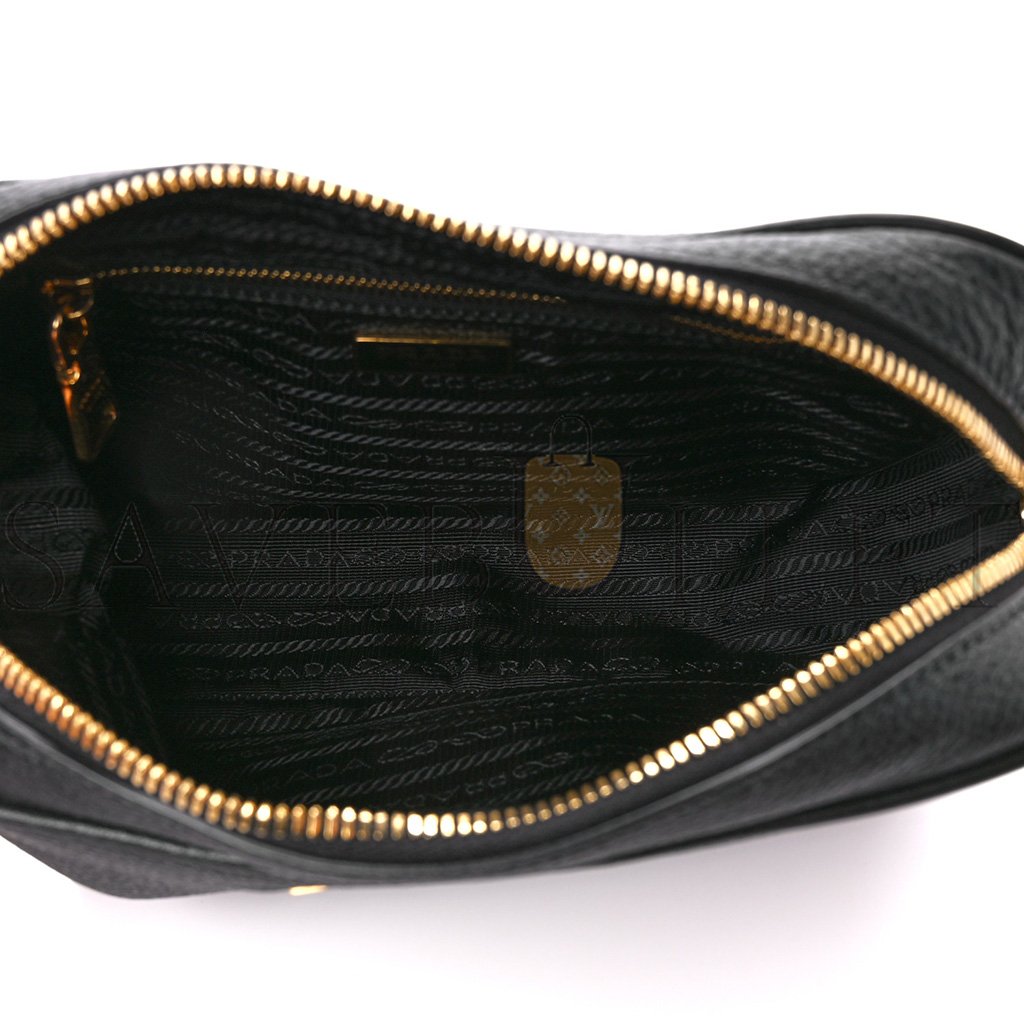 This is an authentic PRADA Vitello Phenix Camera Bag in Black. This stunning crossbody bag is finely crafted of textured black calfskin leather. The bag features a shoulder strap and an extra-long crossbody strap with gold hardware. The top zipper opens to a black Prada jacquard fabric interior.