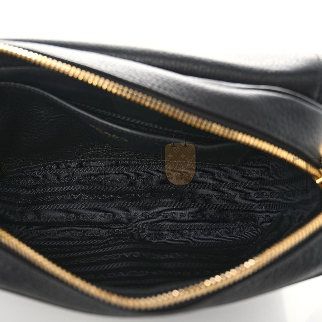 This is an authentic PRADA Vitello Phenix Crossbody Bag in Black. This stunning crossbody bag is finely crafted of textured black calfskin leather. The bag features an adjustable crossbody strap with gold hardware. The front flap opens to a black Prada monogram interior with a pocket.