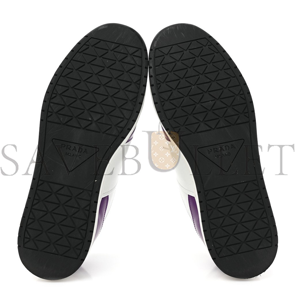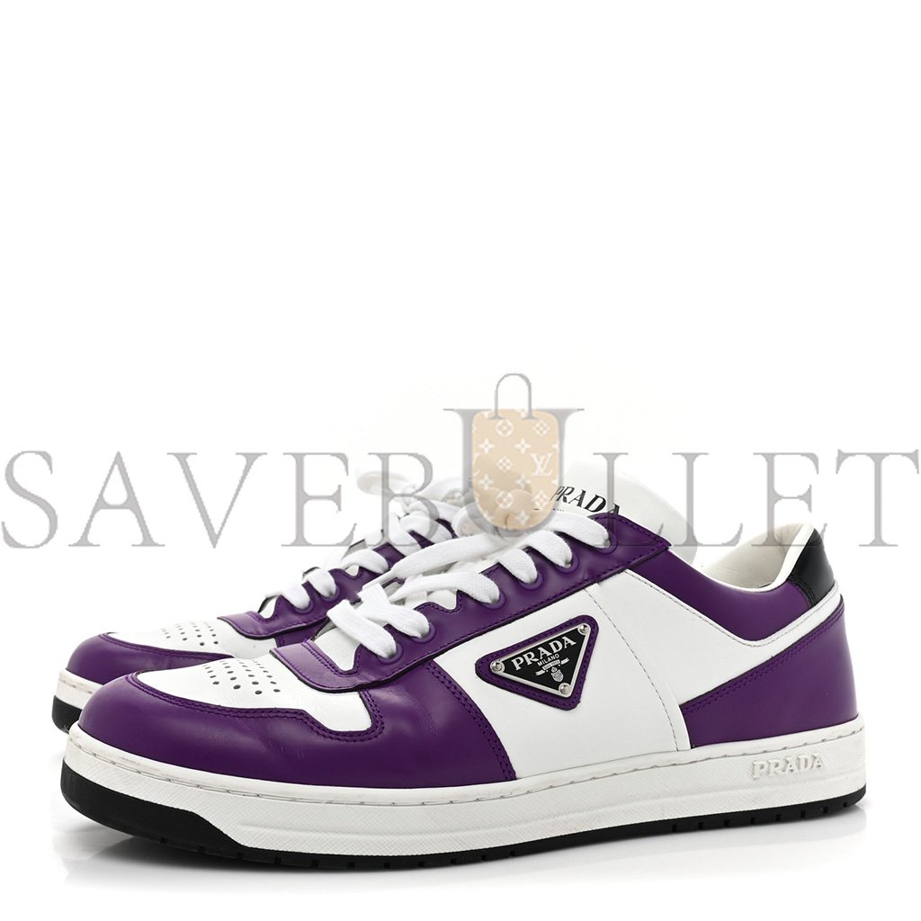 This is an authentic pair of PRADA Vitello Rois Metal Triangle Logo Mens Downtown Low Top Sneakers size 8 in White and Ciclamino. These stylish sneakers are crafted of smooth purple and white leather. They feature the Prada triangle logo on each outer side with white laces and black rubber soles.