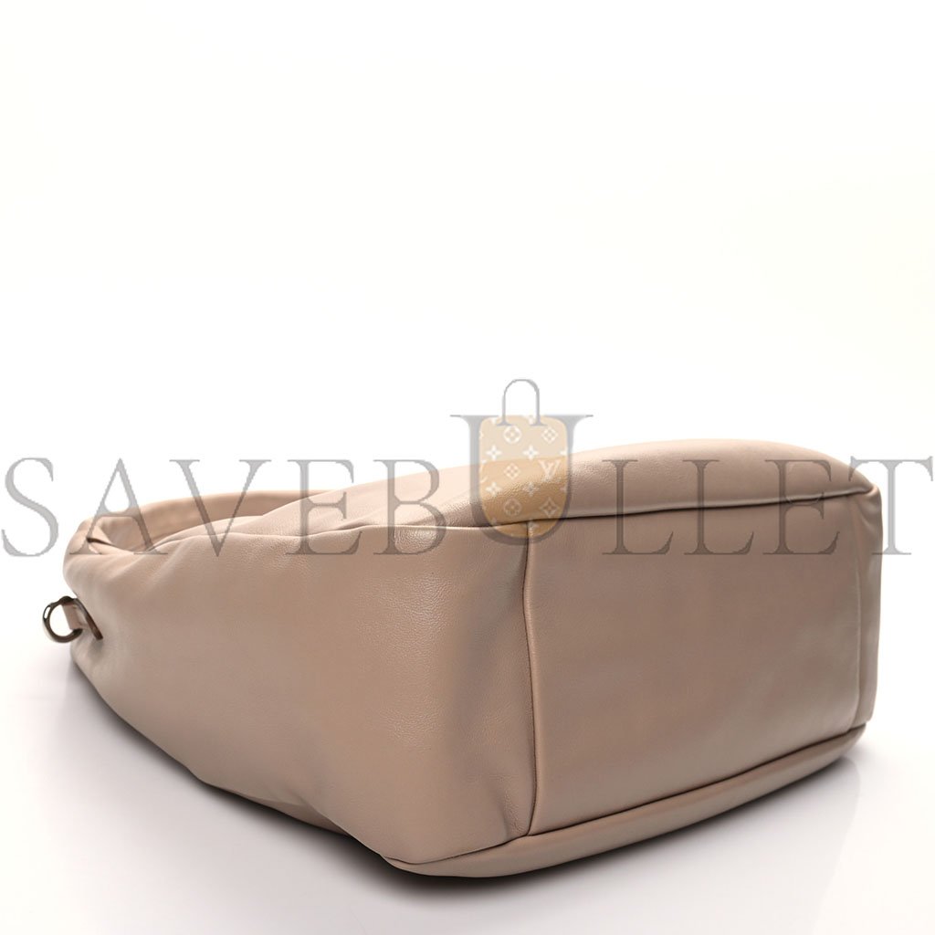 This is an authentic PRADA Vitello Soft Hobo in Cammeo. This classic hobo is crafted of calfskin leather in beige. The bag features a looping leather shoulder strap and silver hardware. The top zipper opens to a black Prada logo jacquard interior with a zipper pocket.