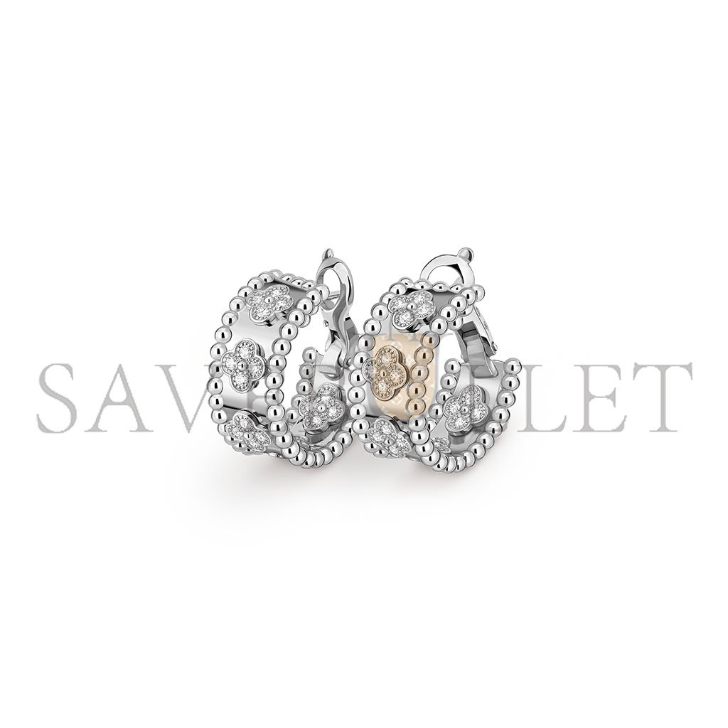Perl茅e clovers hoop earrings, rhodium plated 18K white gold, round diamonds; diamond quality DEF, IF to VVS.