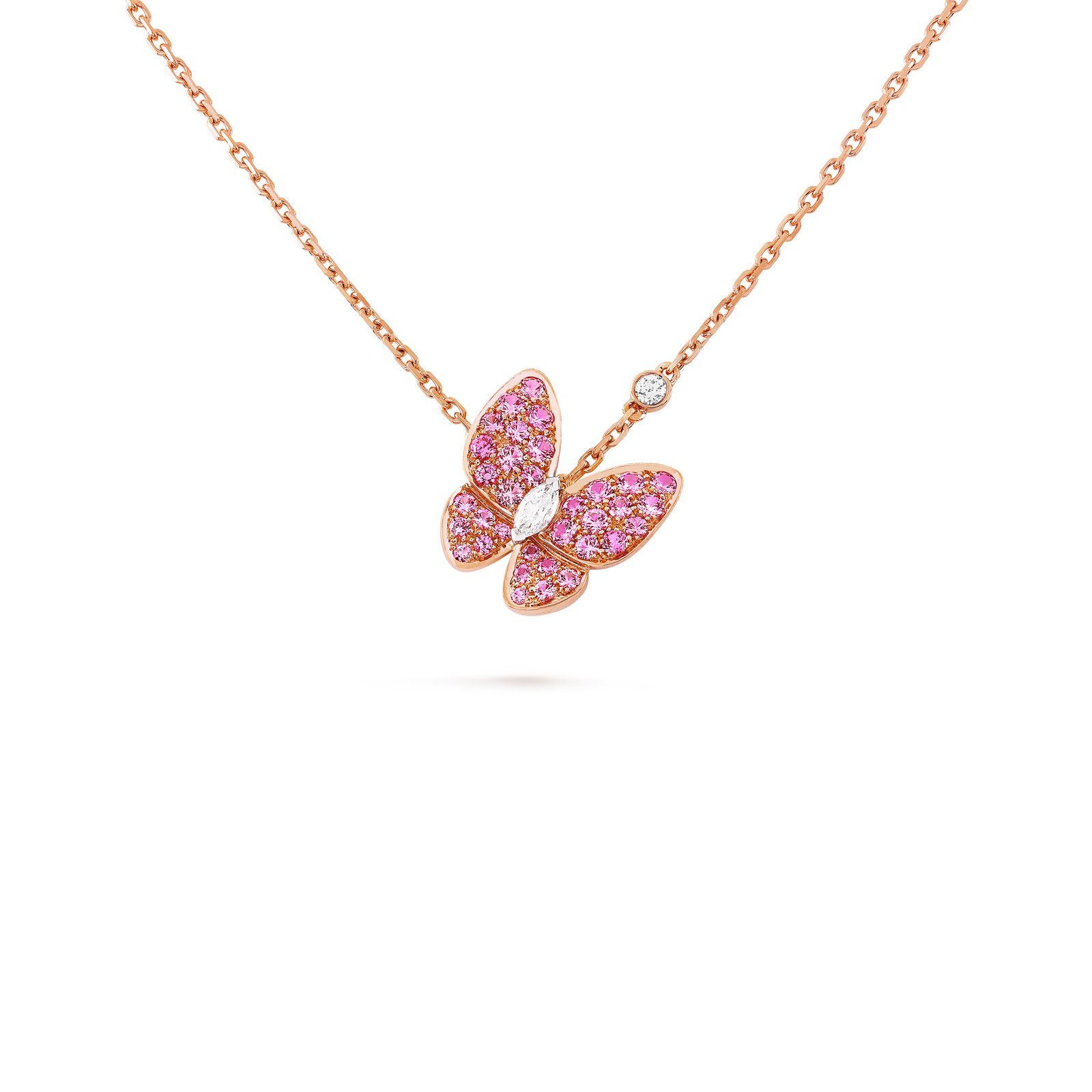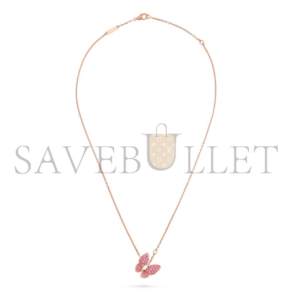 Two Butterfly pendant, 18K rose gold, round pink sapphires, rhodium plated 18K white gold, round and marquise-cut diamonds; diamond quality DEF, IF to VVS.